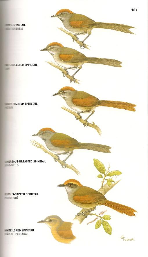Nearly all illustrations for the passerines are taken directly from another South America book, which is the condensed "Field Guide to the Songbirds of South America: Passerines" by Ridgely/Tudor in 2009. These same illustrations seem to have been enlarged by about 15% for this new book. As a plus, some species not illustrated in the prior book are now shown in this newest book. Examples include Fawn-breasted Wren, Cone-billed Tanager, Southern Antpipit, and Reiser's Tyrannulet. Unfortunately, several birds are still represented by only text such as the Forbe's Blackbird, Chapada Siuriri, and the Olivaceous Elaenia.